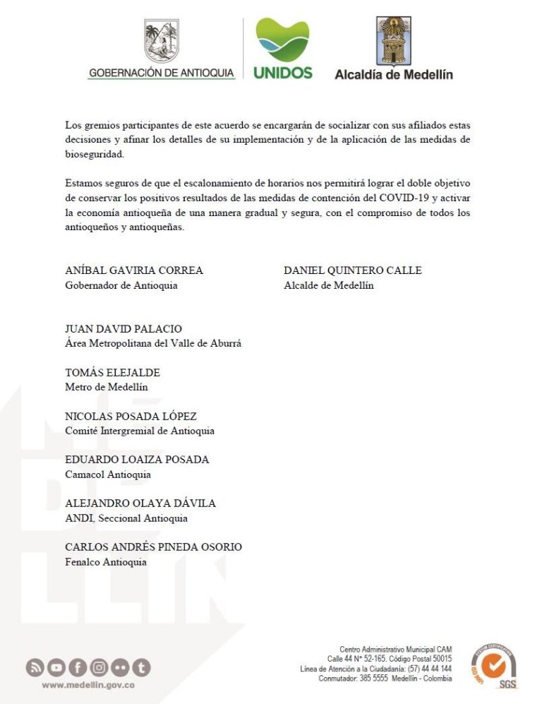 Es importante anotar que se conformará una “Mesa de Reactivación” conformada por Gobernación de Antioquia, Alcaldía de Medellín, Área Metropolitana, Metro de Medellín, Andi, Fenalco, Camacol y Comité Intergremial de Antioquia, para hacer seguimiento a la estrategia y a diario evaluar su eficacia.
