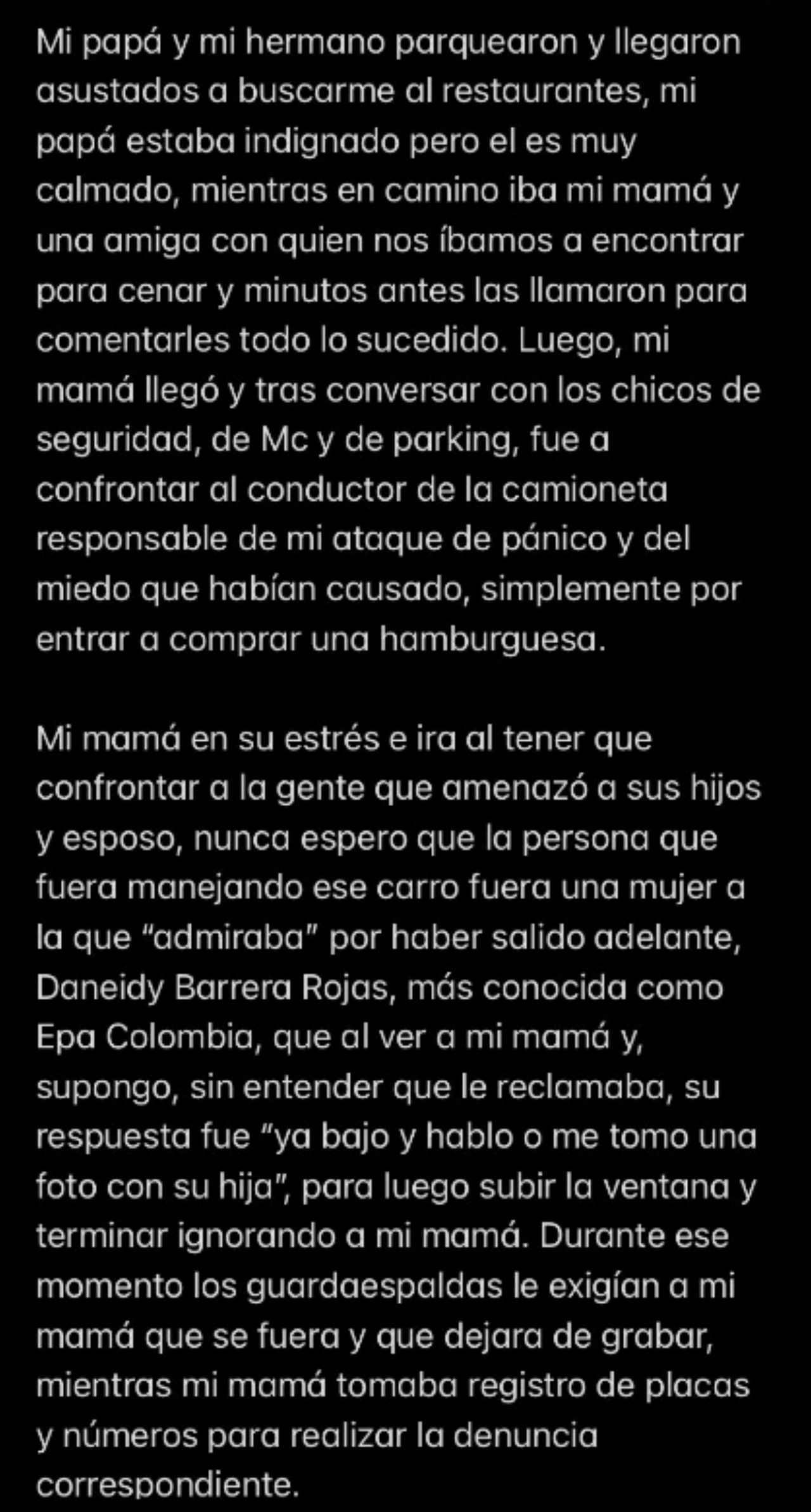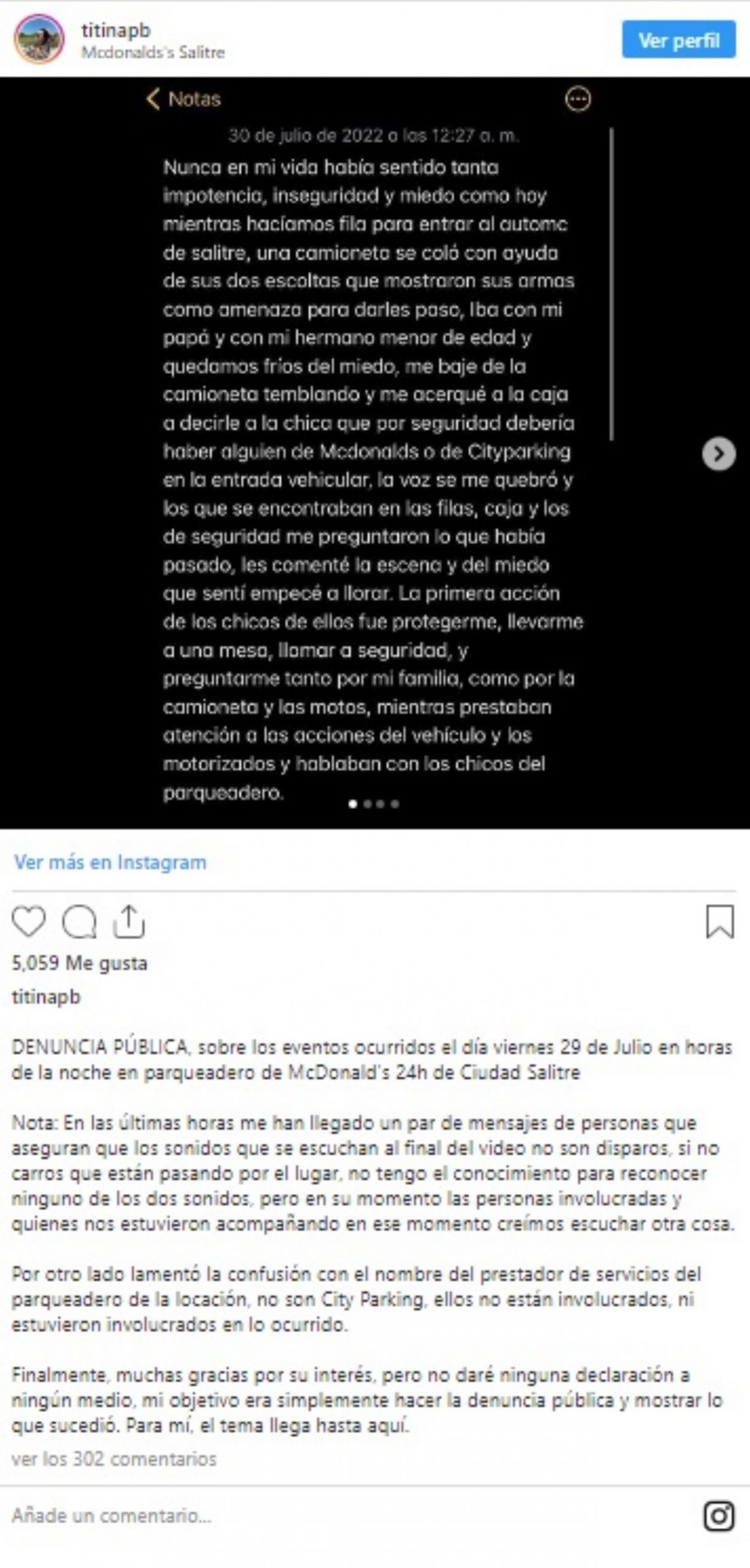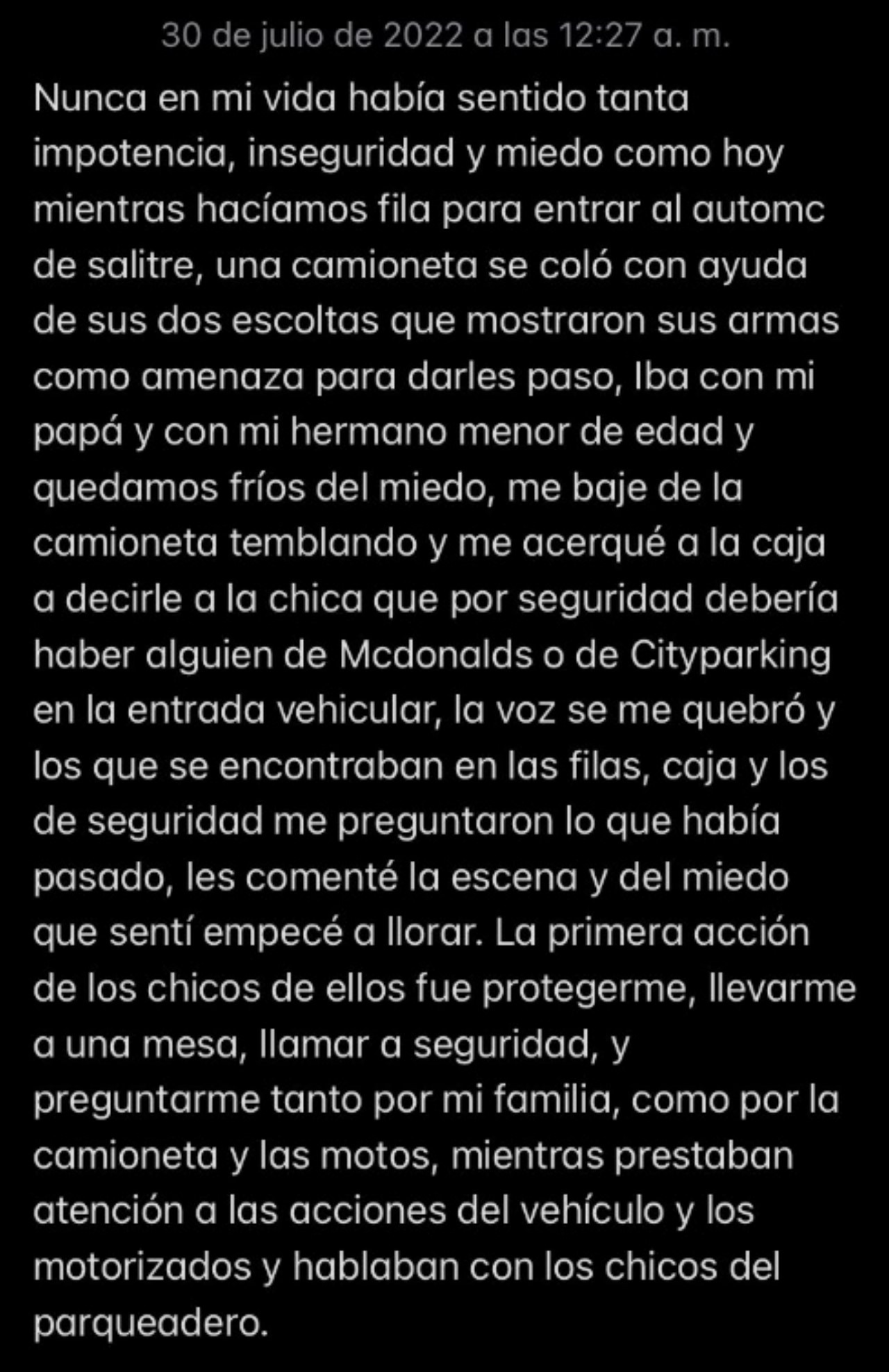 “Nunca en mi vida había sentido tanta impotencia, inseguridad y miedo como hoy mientras hacíamos fila para entrar al auto Mac de salitre. Una camioneta se coló con ayuda de sus dos escoltas que mostraron sus armas como amenaza para darles paso”, expresó uno de los implicados por medio de sus redes sociales.