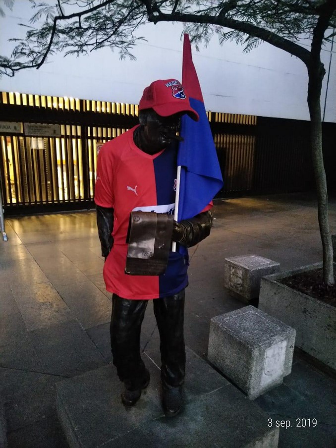Este martes en la mañana empleados y transeúntes del Centro Administrativo La Alpujarra, CAM, se llevaron una gran sorpresa de cuenta del atuendo de las tradicionales esculturas del lugar.