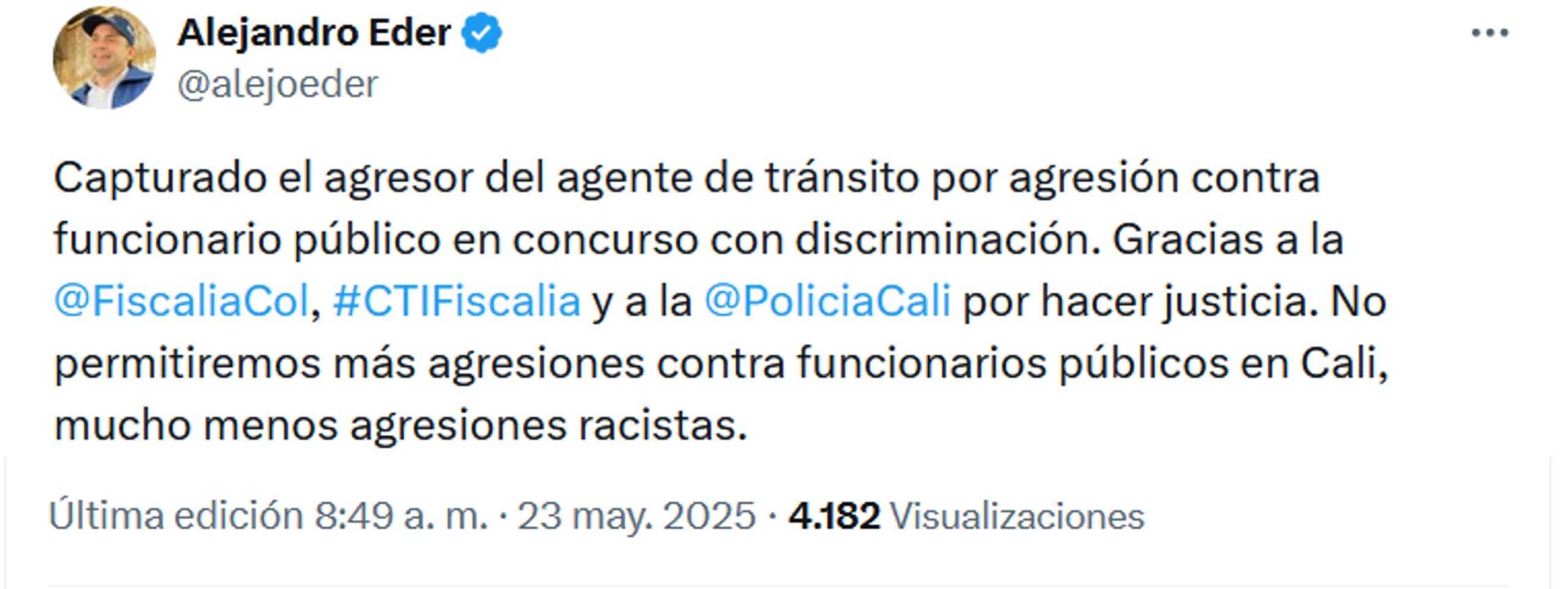 El alcalde de Cali, Alejandro Eder, anunció la captura del responsable de agredir a un agente de tránsito, en un caso que ha generado indignación pública por tratarse no solo de una agresión física, sino también por tener connotaciones racistas. El hecho fue calificado por las autoridades como un caso de agresión contra funcionario público en concurso con discriminación.