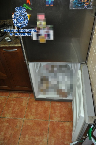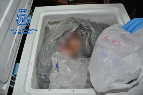 Los agentes se han desplazado junto al presunto autor de los hechos hasta la vivienda, donde han hallado un congelador independiente en el interior de un mueble de la cocina. Dentro de este congelador se encontraba una bolsa de hielo, bajo la cual había restos óseos y vello corporal. El congelador del frigorífico principal de la vivienda también servía para ocultar más restos del cadáver, descuartizado en varias secciones con cortes precisos.