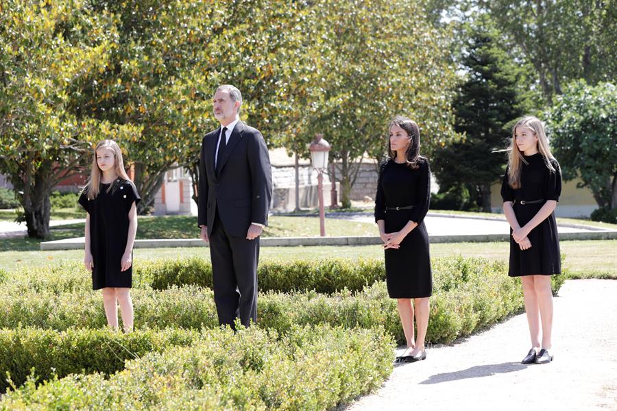 Los reyes Felipe y Letizia, y sus hijas, la princesa de Asturias y la infanta Sofía, vestidos de luto riguroso, permanecieron en silencio frente a la fachada del edificio principal del Palacio de la Zarzuela, en Madrid, ante una bandera de España a media asta.
