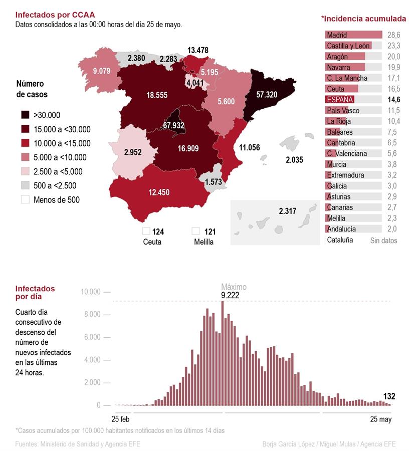 Los nuevos contagios confirmados mediante PCR también bajaron hasta los 132 (246 ayer) y suman 235.400, después de que el total de este concepto también fue rectificado y es inferior en 372 casos.