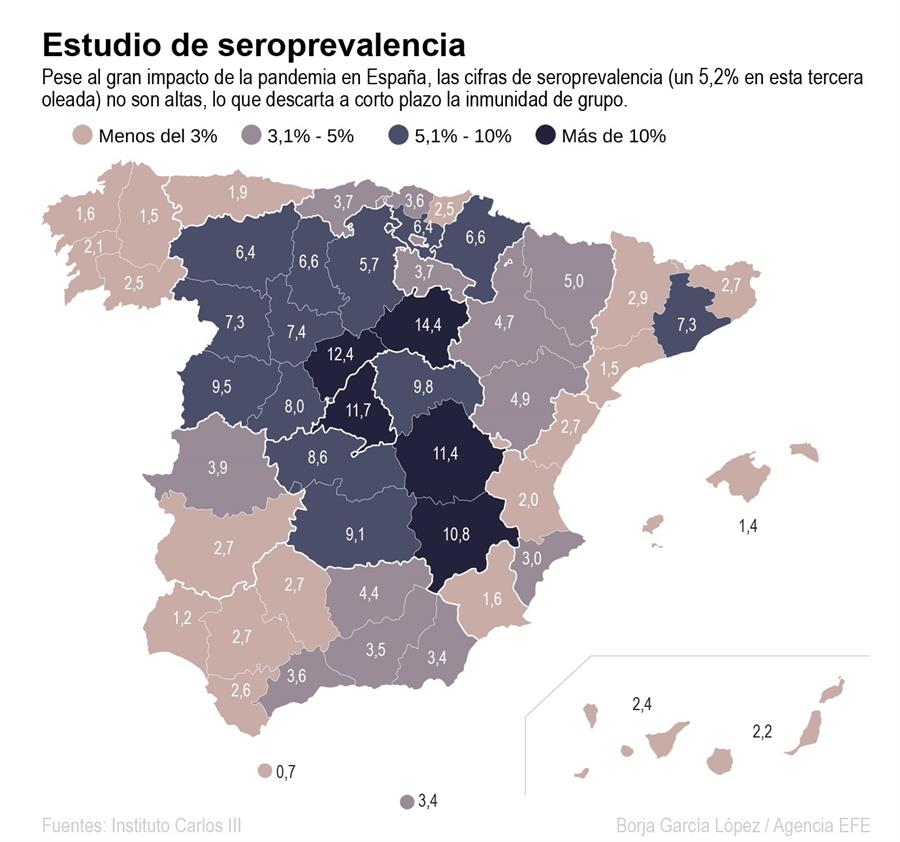 Las autoridades sanitarias españolas confirmaron también hoy que la población del país no tiene inmunidad de grupo frente a la pandemia, al divulgar los resultados de la tercera y última fase del estudio de seroprevalencia realizado por el Ministerio de Sanidad.Solo un 5,2 % de los españoles se contagió del coronavirus, según ese estudio, cifra similar a la de las dos fases anteriores.Todos estos datos apuntan a que “estamos muy lejos de alcanzar la inmunidad de rebaño” y a que sería “muy poco ético” exponer a la población al virus para conseguirla, afirmó en rueda de prensa la directora del Centro Nacional de Epidemiología, Marina Pollán.El informe se realizó desde el 27 de abril pasado entre unas 90.000 personas de más de 36.000 hogares repartidos por todo el país.Un aspecto inquietante de esta tercera oleada del estudio es que entre la primera y segunda ronda de la investigación, un 7 % de los participantes dejaron de tener anticuerpos detectables de COVID-19, porcentaje que subió al 14 % entre la segunda y la tercera.A pesar de ello, Pollán señaló que no poder detectar anticuerpos no significa que esas personas no estén inmunológicamente protegidas.Explicó que esta “pérdida” de los anticuerpos fue más frecuente en personas que no habían tenido ningún síntoma (11 %) entre las rondas 1 y 2, y mucho menor en los participantes con una prueba positiva por PCR positiva (0,5 %) o en quienes describieron pérdida súbita del olfato o del gusto (2,6 %).Por otra parte, varios obispos católicos, encabezados por el cardenal arzobispo de Madrid, Carlos Osoro, concelebrarán hoy un funeral en la capital por todas las víctimas de la pandemia en el país; un servicio religioso al que asistirán los reyes de España y sus hijas, las infantas, entre otras autoridades y representantes de varias confesiones.