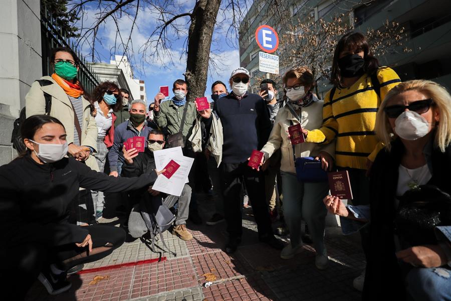 Protegidos con mascarillas y con sus pasaportes españoles en la mano, los manifestantes se concentraron en la puerta de la sede diplomática ubicada en un acomodado barrio de Montevideo para denunciar la situación vulnerable en la que se encuentran.