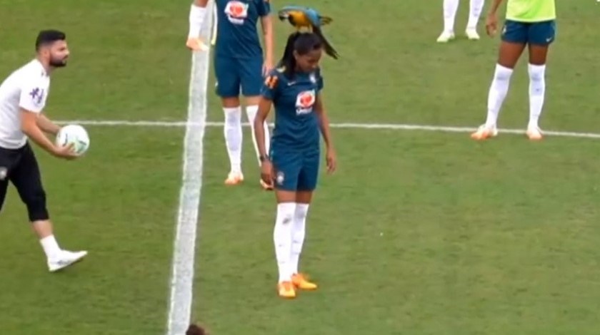 Un guacamayo se posó sobre la cabeza de la futbolista brasileña Bruna Benties mientras disputando un partido como parte de los entrenamientos. El video se ha vuelto viral en redes.