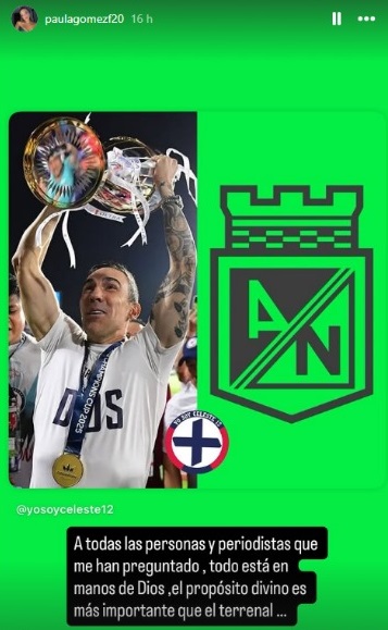 La frase enigmática de Paula Gómez fue acompañada por una imagen significativa: el estratega levantando un título, y junto a ella, el escudo de Atlético Nacional.