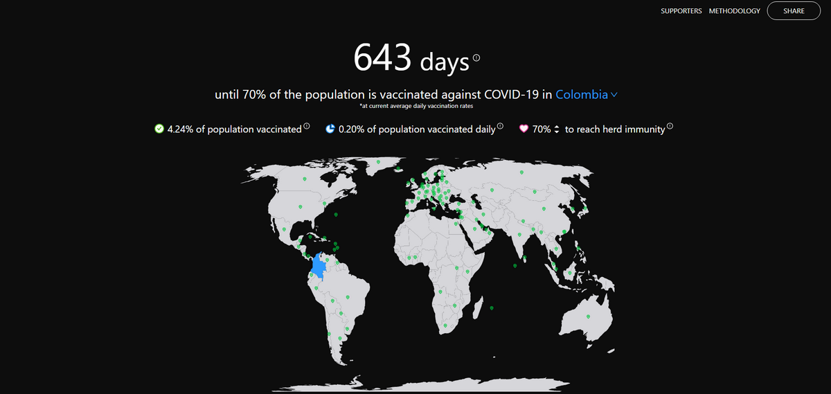 Minuto30 hizo el Ejercicio, y según el sitio en Colombia faltan 643 días para que se logre la totalidad. En la plataforma, también se muestra la población que ha sido vacunada y la población vacunada diariamente.