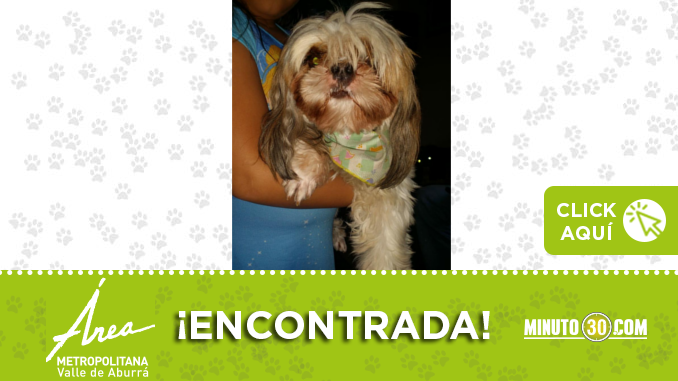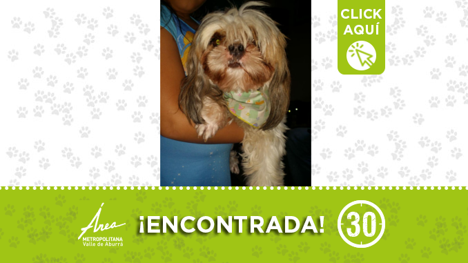 Esta perrita fue encontrada en el Parque de La Milagrosa, es de raza Shih Tzu tiene una pañoleta verde clara con un collar morado debajo de la pañoleta, es color miel con manchas blancas.