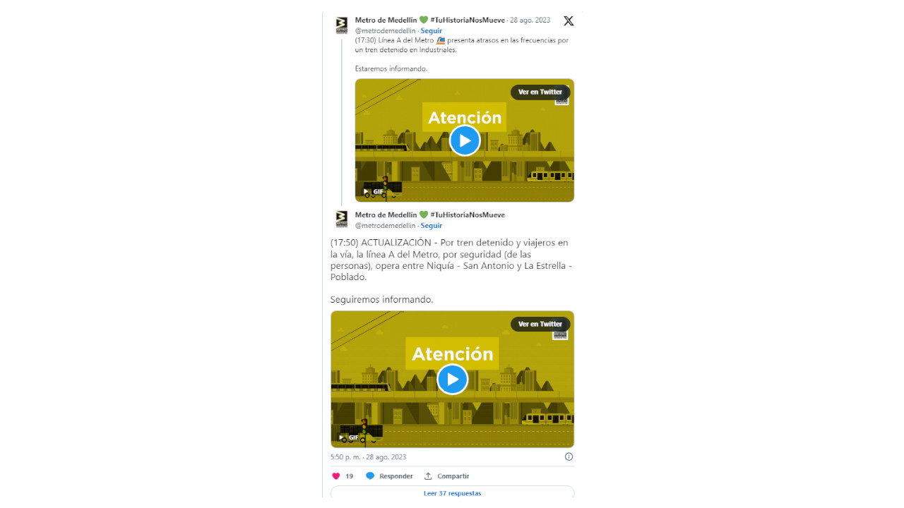 Minutos más tarde, a las 5:50 de la tarde afirmaron que la Línea A solo opera entre Niquía – San Antonio y La Estrella – Poblado.
