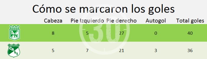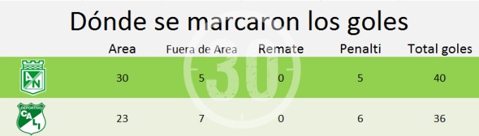 Mientras que Cali convirtió el 58% de los goles con el pie derecho, el 70% durante el segundo tiempo y el 64% de los tantos convertidos dentro del área.