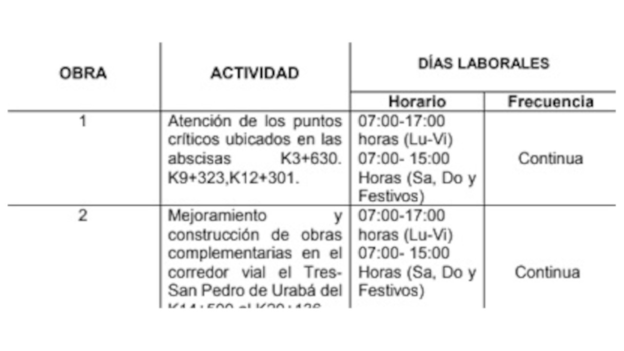 ⦁ El Tres – San Pedro de Urabá: se cuenta con el Plan de Manejo de Tránsito, el cual incluye cierres parciales de la vía que el corregimiento El Tres del municipio de Turbo conduce al Municipio de San Pedro de Urabá, para corregir los puntos críticos que se presentan en los km 3+630, km 9+323 y km 12+301, además de la pavimentación de un tramo entre el km 14+500 y el km 20+136. Según Resolución No. 2023060000504 de la Agencia de Seguridad Vial Departamental del 10 de enero de 2023. La terminación de actividades estaría prevista para el 30 de agosto del presente año. Horarios de intervención: