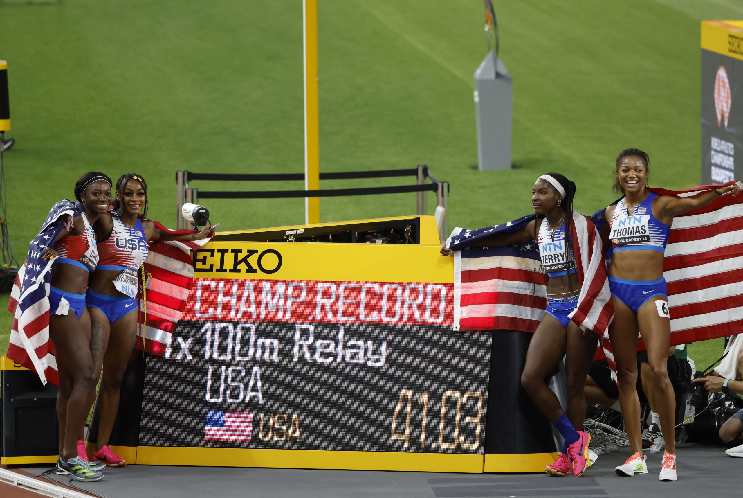 El relevo femenino, compuesto por Tamara Davis, Twanisha Terry, Gabrielle Thomas y Sha'Carri Richardson, celebró una medalla de oro con récords de los Mundiales, ya que registraron en meta 41.03.