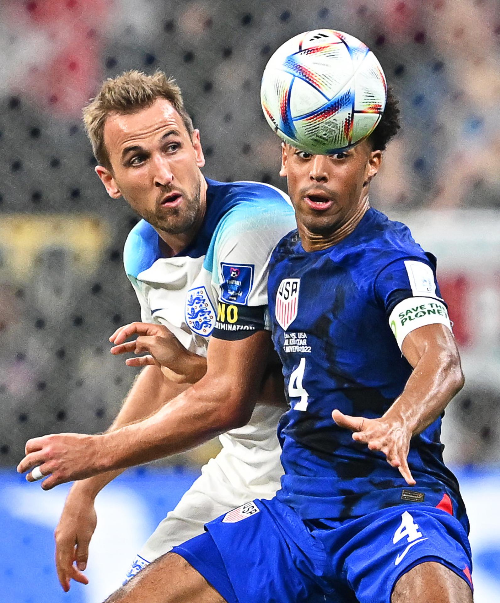 Al Khor (Qatar), 25/11/2022.- Harry Kane (L) of England in action against Tyler Adams (R) of the USA during the FIFA World Cup 2022 group B soccer match between England and the USA at Al Bayt Stadium in Al Khor, Qatar, 25 November 2022. (Mundial de Fútbol, Estados Unidos, Catar) EFE/EPA/Noushad Thekkayil