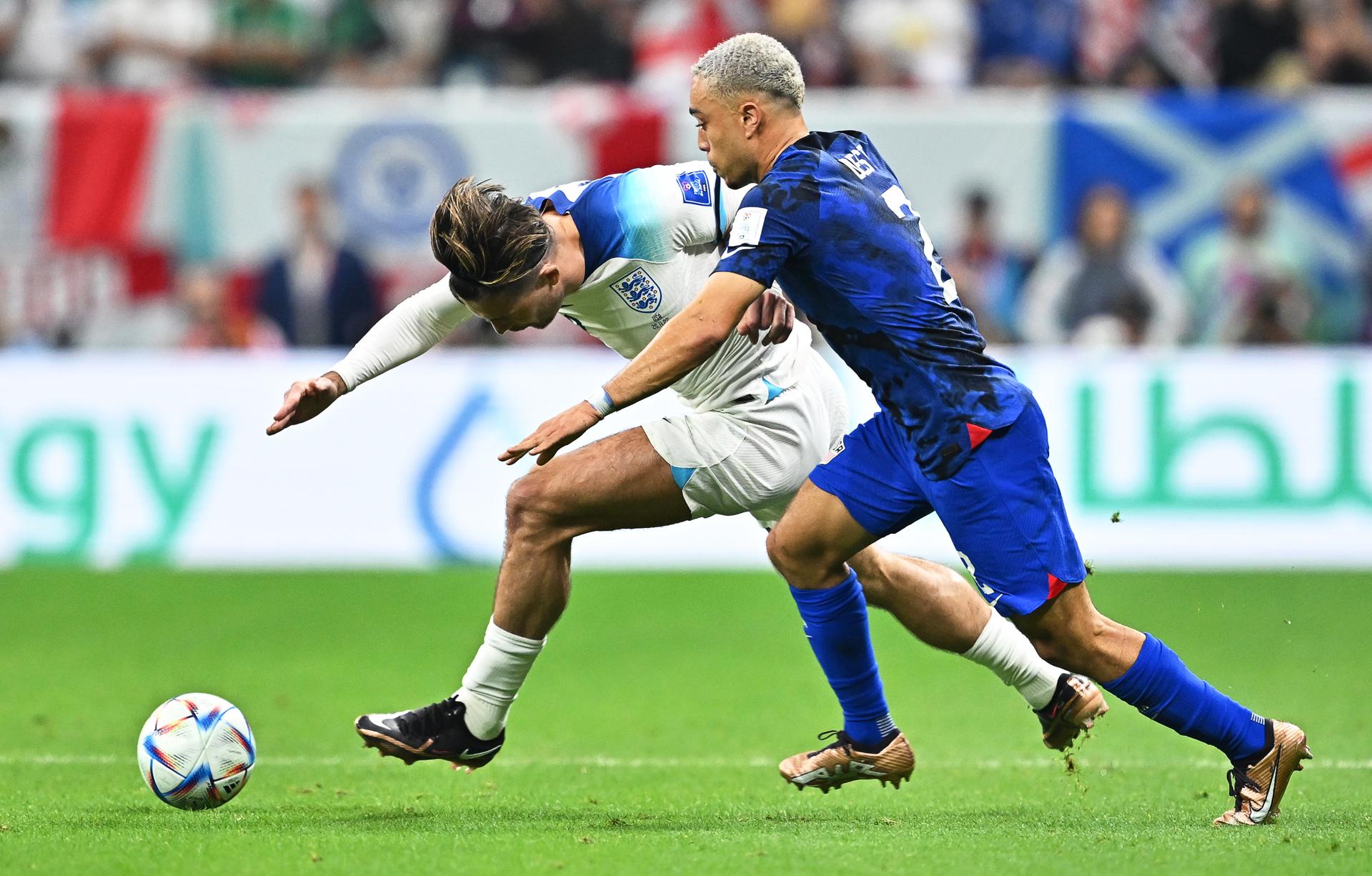 Al Khor (Qatar), 25/11/2022.- Sergino Dest (L) of the USA in action against Jack Grealish (C) of England during the FIFA World Cup 2022 group B soccer match between England and the USA at Al Bayt Stadium in Al Khor, Qatar, 25 November 2022. (Mundial de Fútbol, Estados Unidos, Catar) EFE/EPA/Noushad Thekkayil