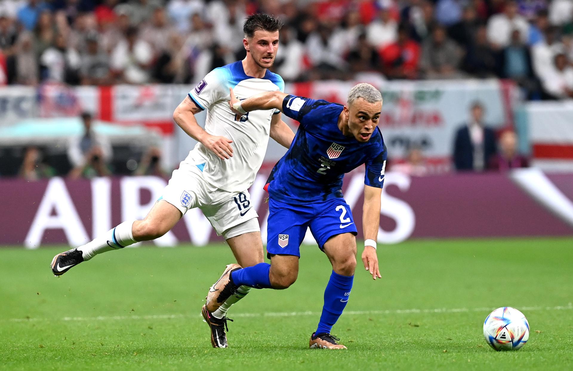 Al Khor (Qatar), 25/11/2022.- Mason Mount (L) of England in action against Sergino Dest of the US during the FIFA World Cup 2022 group B soccer match between England and the USA at Al Bayt Stadium in Al Khor, Qatar, 25 November 2022. (Mundial de Fútbol, Estados Unidos, Catar) EFE/EPA/Neil Hall