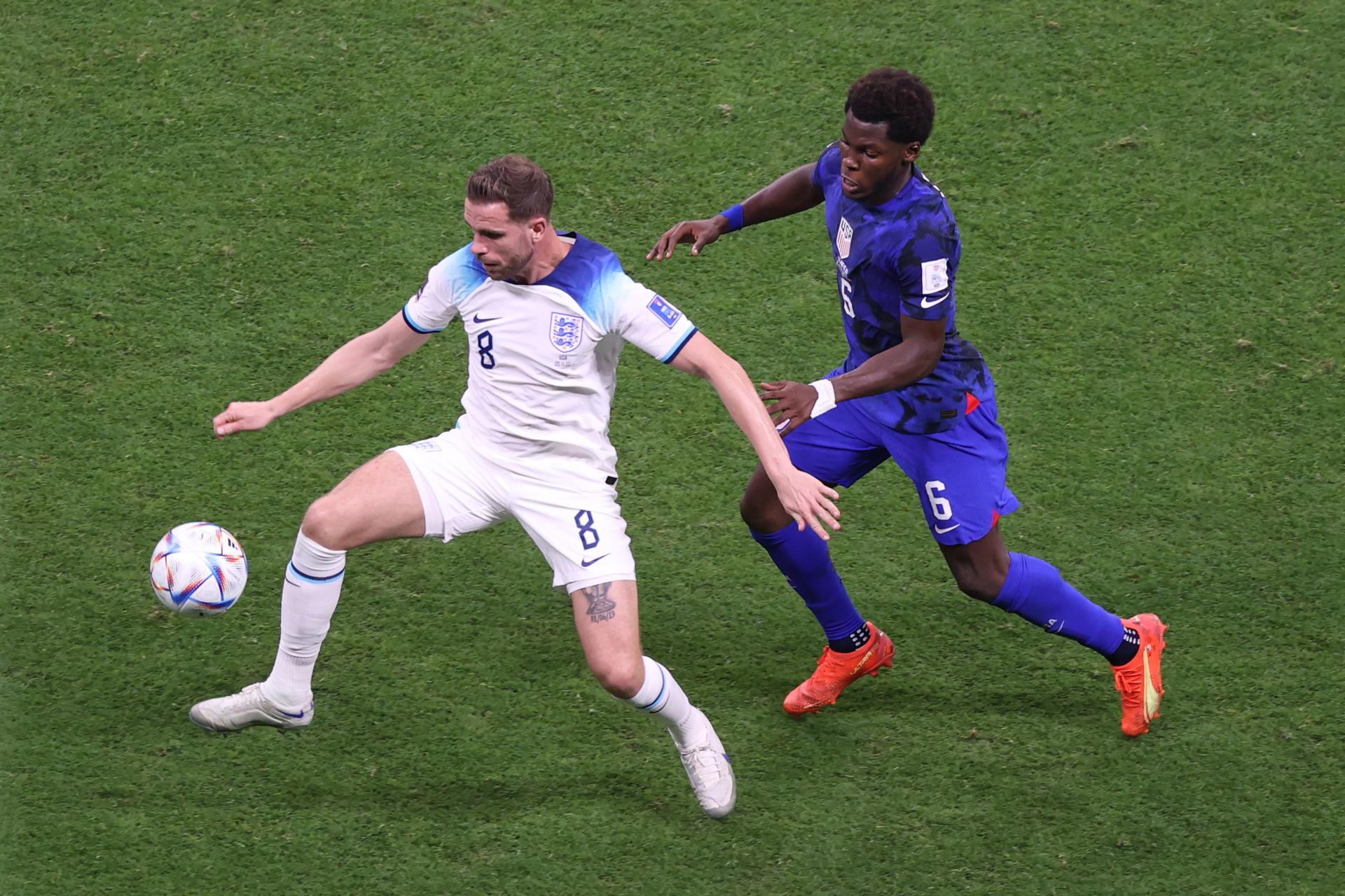 Al Khor (Qatar), 25/11/2022.- Jordan Henderson of England (L) in action against Yunus Musah of the US (R) during the FIFA World Cup 2022 group B soccer match between England and the USA at Al Bayt Stadium in Al Khor, Qatar, 25 November 2022. (Mundial de Fútbol, Jordania, Estados Unidos, Catar) EFE/EPA/Mohamed Messara