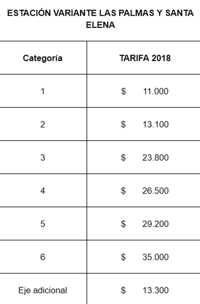 Minuto30.com- A partir de este jueves fueron reajustadas las tarifas de peajes en las estaciones de recaudo de la Variante Las Palmas y Santa Elena, las cuales corresponden a la Concesión Conexión Víal Aburrá- Oriente (Túnel de Oriente y Desarrollo Vial Complementario).