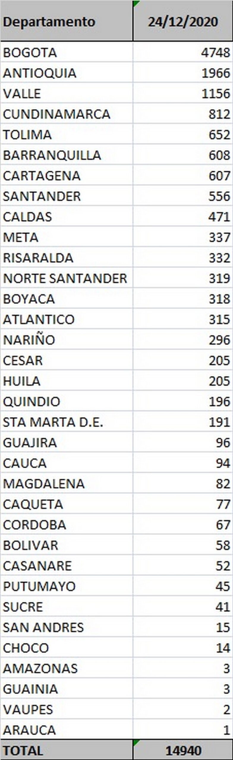 El Ministerio de Salud emitió un nuevo informe con el reporte de los nuevos casos de contagio de Covid – 19; este jueves 24 de diciembre, se presentaron 14.940 casos nuevos.