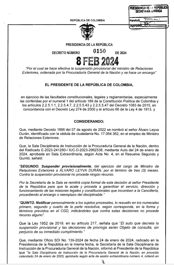 Murillo estará en el cargo por tres meses, mientras dura la suspensión de Álvaro Leyva, impuesta por la Procuraduría General de la Nación, en medio del caso por la licitación de los pasaportes.