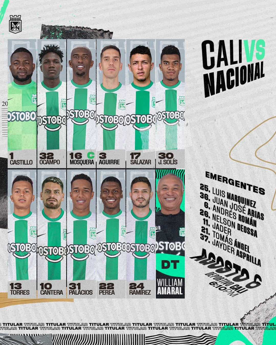 El verde paisa jugará con Harlen ‘Chipi chipi’ Castillo, Édier Ocampo, Sergio Mosquera, Felipe Aguirre, Andrés Salazar, Jhon Solis, Juan Pablo Torres, Maximiliano Cantera, Brayan Palacios, Òscar Perea y Eric Ramírez.