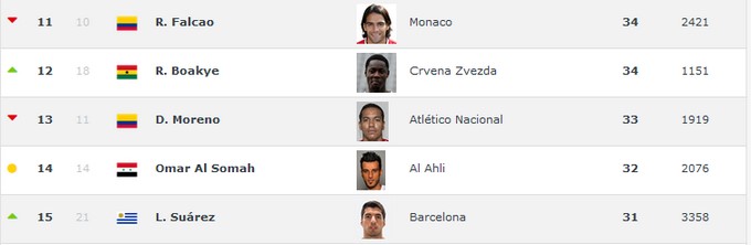 La representación Colombiana viene por el lado de los arietes Radamel Falcao en el puesto 11 (34 goles) y Dayro Moreno 13 (33 goles).