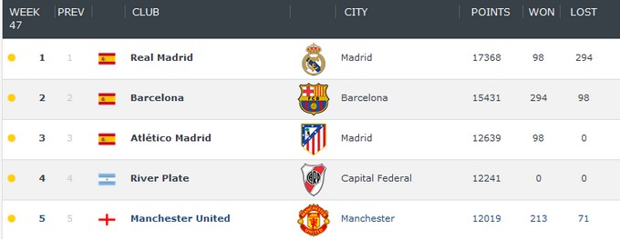 A nivel de equipos, el ranking es liderado por tres equipos españoles; el Real Madrid, Barcelona y el Atlético de Madrid, en su respectivo orden.