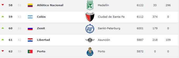 Por Colombia, el equipo que mejor se posiciona es Atlético Nacional, que aparece en el puesto 58, luego aparece Junior de Barranquilla en la posición 73