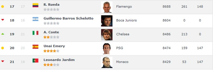 Destaca, eso sí, la aparición en el puesto 17 del entrenador Reinaldo Rueda. También aparece en el puesto 97 el técnico del Junior, el uruguayo Julio Comesaña.