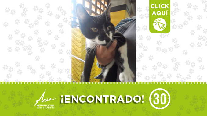 Este gatico fue encontrado en el Éxito de Robledo, tiene collar morado.
