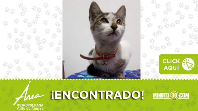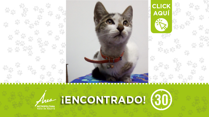 Este gatico fue encontrado en la Urbanización Dulazar 2, es de color blanco con manchas grises, tiene collar naranjado.
