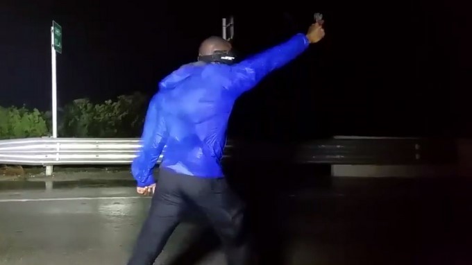 “¡Tenía que salir y probar los vientos de la pared del ojo del huracán!“, afirmó en su cuenta de Twitter.