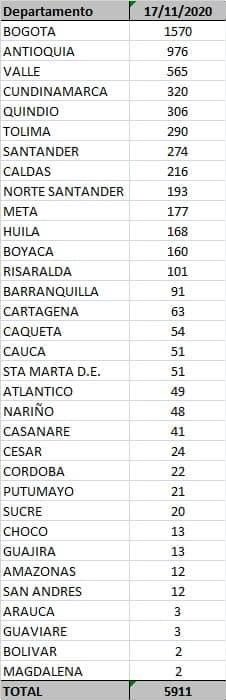 55.073 casos activoshttps://t.co/SiKTpTCQ3W pic.twitter.com/XzGKvKl7DN— MinSaludCol (@MinSaludCol) November 17, 2020