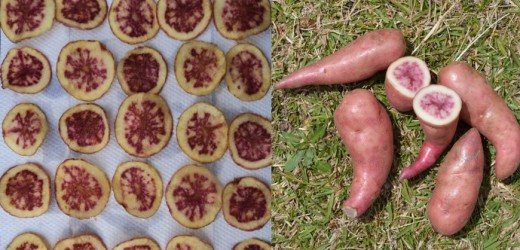 Paysandú es un tubérculo de color morado rojizo, textura suave, color de pulpa amarillo oscuro con vetas morado rojizo oscuro, buen rendimiento y alto contenido de antioxidantes.