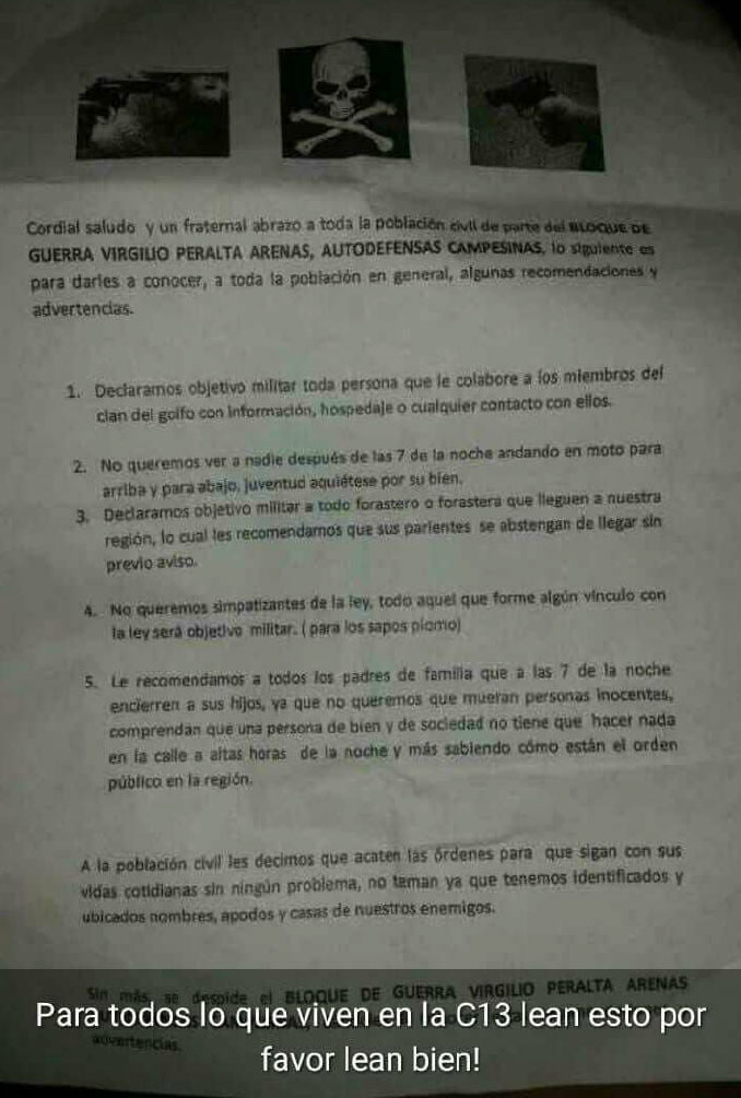 Minuto30.com- Luego de un violento fin de semana en la Comuna 13, San Javier, en el cual fueron asesinadas tres personas y otras cuantas resultaron heridas, además de un paro de algunas rutas alimentadoras del Metro en las estaciones San Javier y Santa Lucía que se presentó este lunes, la situación de orden público continúa dando de qué hablar, esta vez por cuenta de un panfleto supuestamente firmado por el Bloque de Guerra Virgilio Peralta Arenas de las Autodefensas Campesinas.