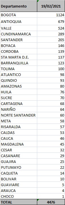 41.237 casos activoshttps://t.co/SiKTpTCQ3W pic.twitter.com/kuFKM2cDCf— MinSaludCol (@MinSaludCol) February 19, 2021