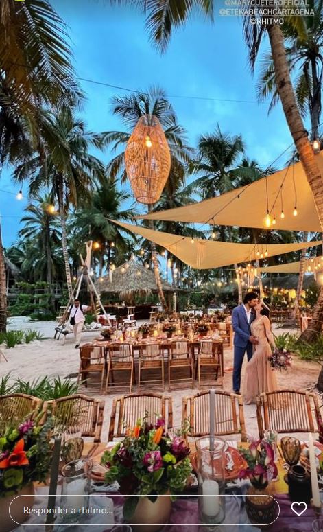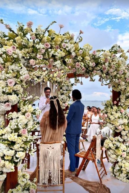 La actriz lució un vestido color beige muy de su estilo, mientras que su ahora esposo vistió un traje azul. El escenario se robó todas las miradas, pues además de ser a la orilla del mar, las flores en la decoración abundaron.