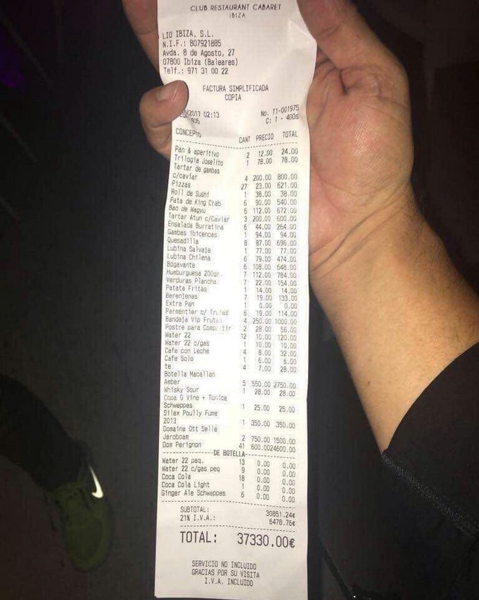 27 pizzas, 41 botellas de champaña, y una gran cantidad de productos, para una módica suma de más de 37.000 euros (unos 124 millones de pesos colombianos). ¡Qué noche!
