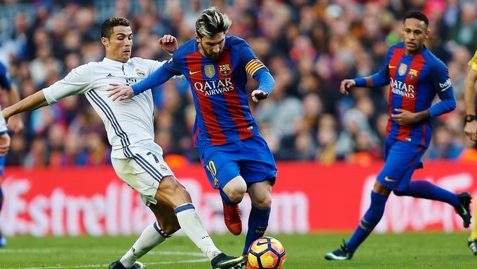 El delantero argentino del FC Barcelona Lionel Andrés Messi (c) y el delantero portugués del Real Madrid Cristiano Ronaldo