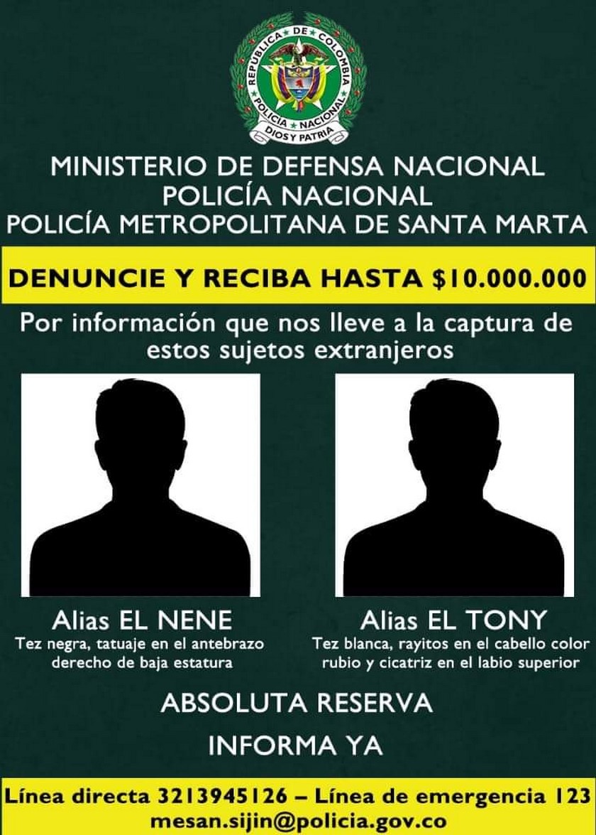 El comandante de la Policía Metropolitana, Coronel Oscar Solarte, manifestó para medios locales que las autoridades ofrecieron hasta 10 millones de recompensa para quien ayude a ubicar a estos dos hombres que habitaban de manera irregular en Santa Marta, aproximadamente desde hace un año y medio.