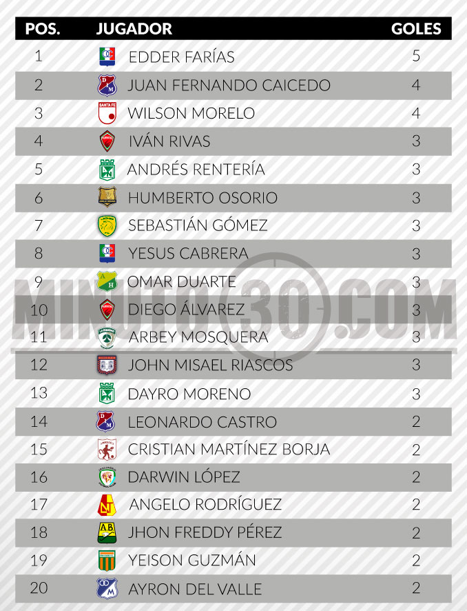 A la cabeza se encuentra el artillero de Once Caldas, Edder Farias con 5 anotaciones y buscará sumar más este lunes a las 7:30 ante Rionegro Águilas.