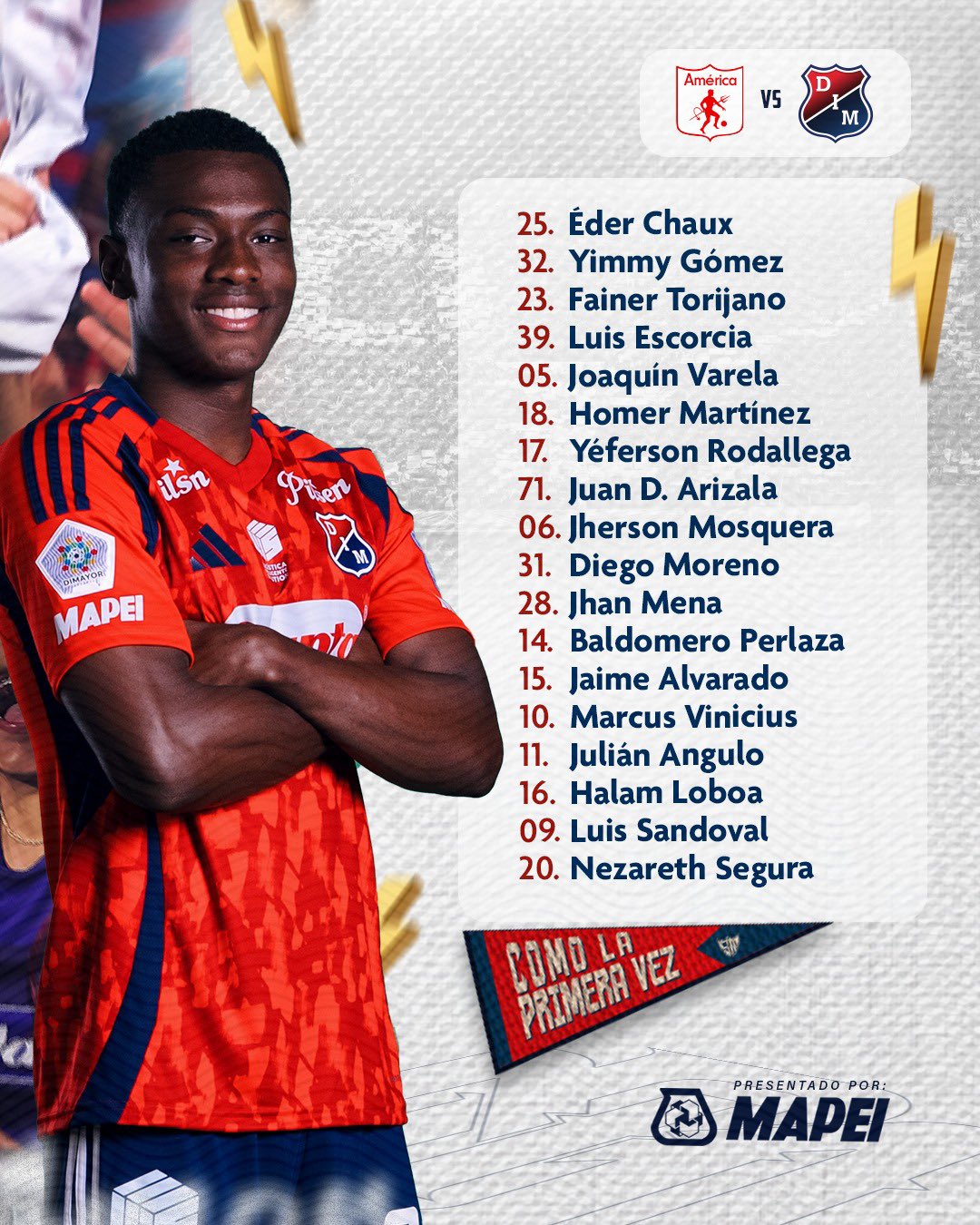 Resumen: Alejandro Restrepo, técnico del Deportivo Independiente Medellín (DIM), ha anunciado la lista de 18 jugadores que viajaron al Valle del Cauca para enfrentar al América de Cali. La convocatoria incluye a los porteros Éder Chaux y Yimmy Gómez; los defensas Fainer Torijano, Luis Escorcia, Joaquín Varela, Homer Martínez, Yéferson Rodallega, Juan Arizala y Jherson Mosquera; los mediocampistas Diego Moreno, Jhan Mena, Baldomero Perlaza, Jaime Alvarado, Marcus Vinicius y Julián Angulo; y los delanteros Halam Loboa, Luis Sandoval y Nezareth Segura.