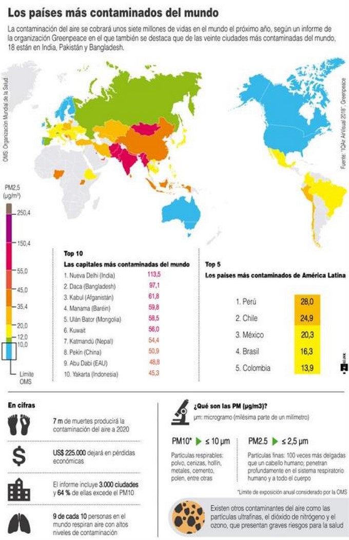 La contaminación del aire se cobrará unos siete millones de vidas en el mundo el próximo año, según un informe de la organización Greenpeace en el que también se destaca que de las veinte ciudades más contaminadas del mundo, 18 están en India, Pakistán y Bangladesh.