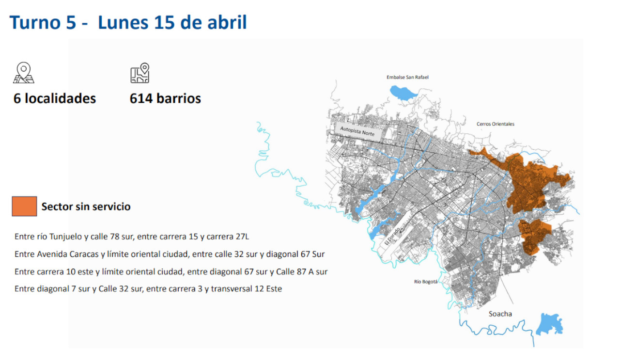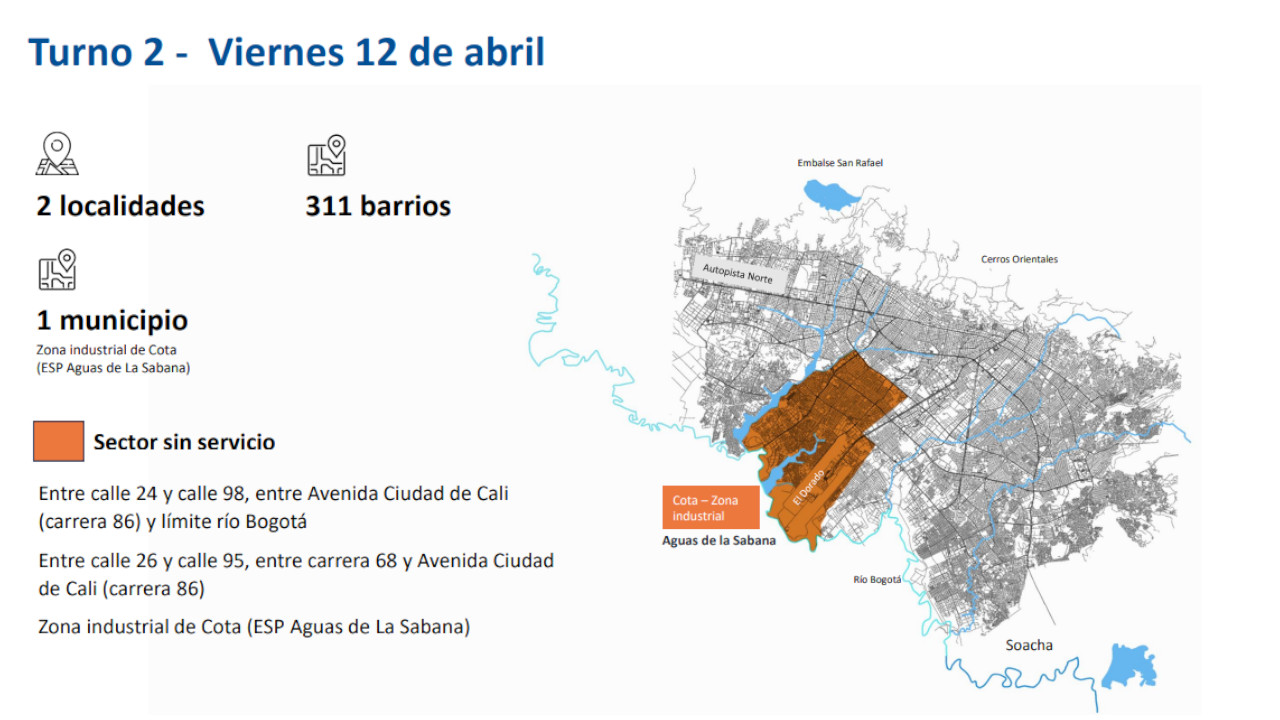Para el miércoles 17 de abril en dos localidades con 215 barrios y los municipios de Funza, Madrid y Mosquera; regirá el séptimo turno de restricción.