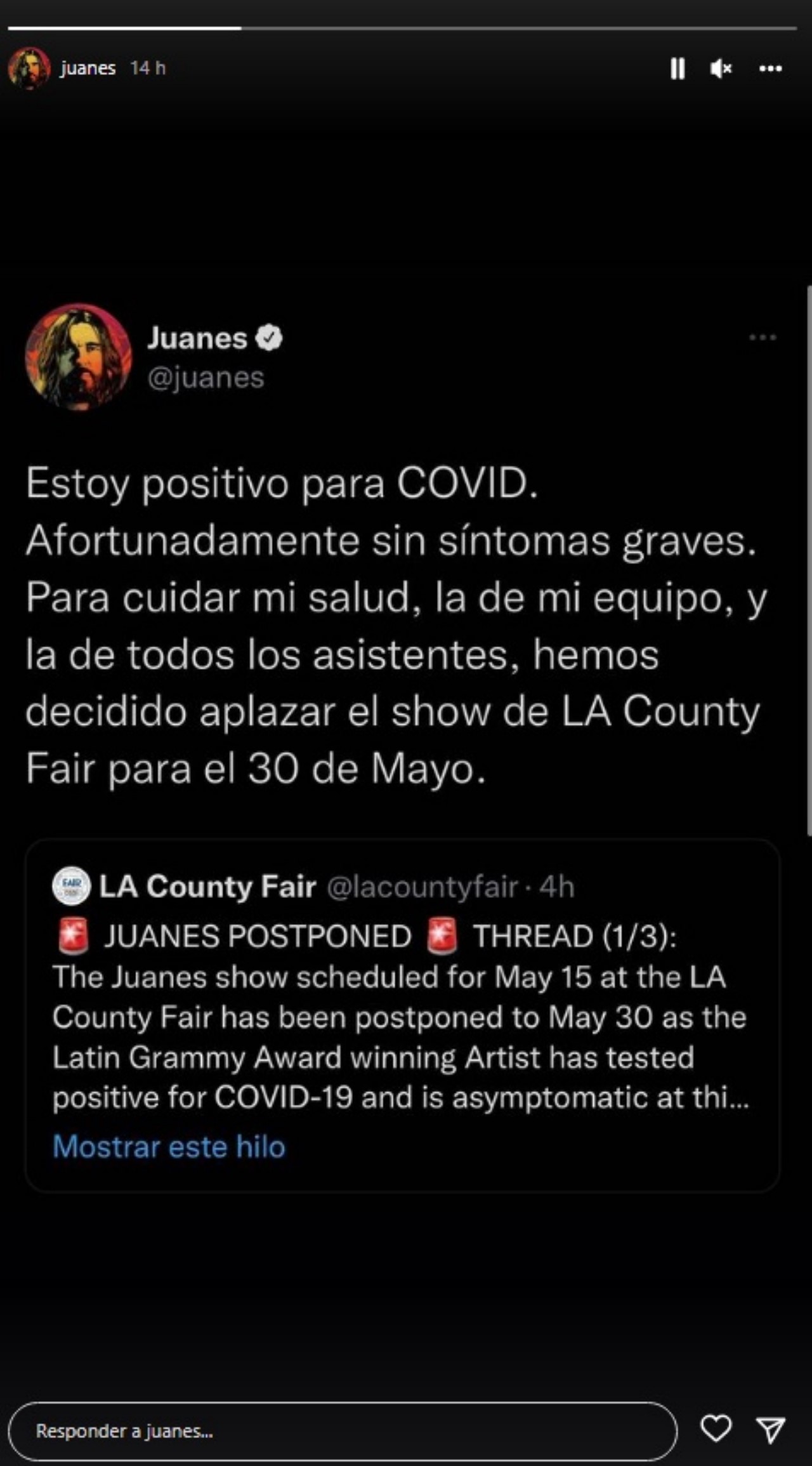 En su cuenta de Twitter detalló: “Estoy positivo para COVID. Afortunadamente sin síntomas graves. Para cuidar mi salud, la de mi equipo, y la de todos los asistentes, hemos decidido aplazar el show de LA County Fair para el 30 de Mayo”.