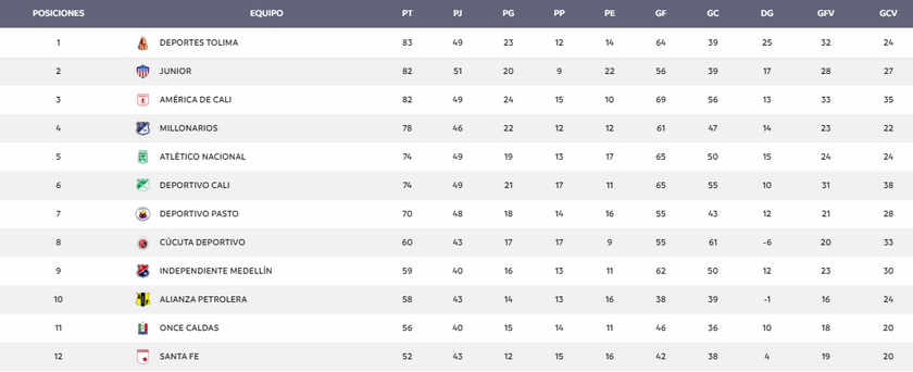 Por lo pronto, Millonarios se sitúa en  la cuarta casilla, con 78 unidades, pero dado que ya no está en competencia seguirá perdiendo puestos en esta tabla. Sin embargo, su presencia en la Copa Sudamericana la tiene asegurada.
