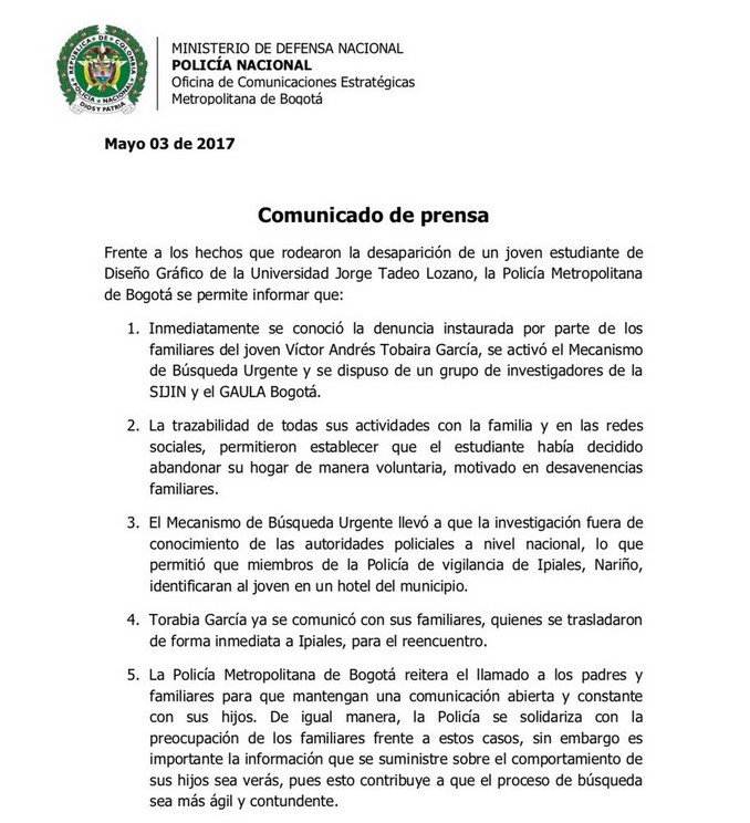 El joven había sido reportado como desaparecido, el pasado jueves 27 de abril. La Policía Metropolitana de Bogotá activó el mecanismo de búsqueda con la SIJIN y el Gaula.