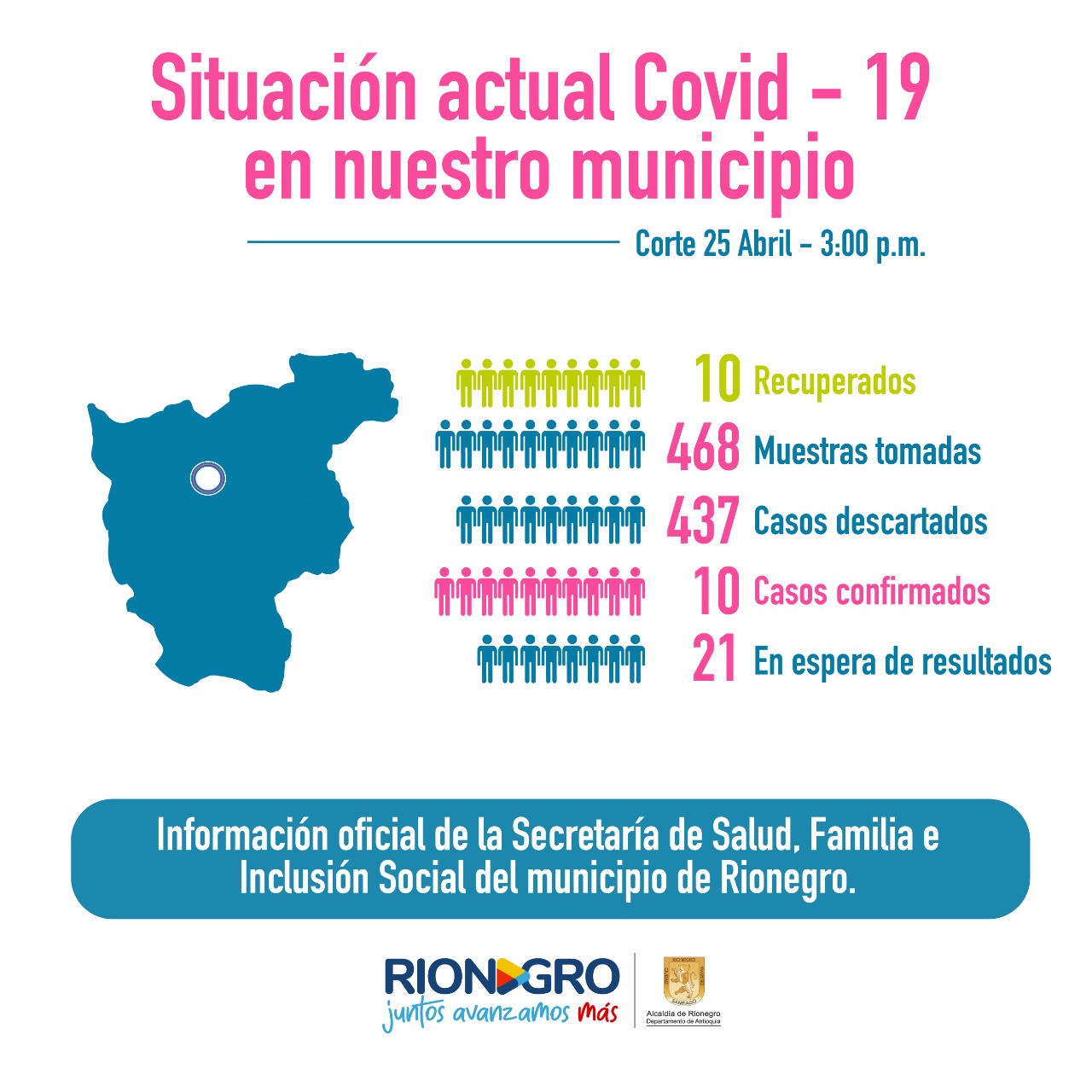 Así mismo, se destaca que Rionegro completa 16 días sin registrar nuevos contagios y que el número de casos pendientes de resultados se redujo a 21 y se espera que en las próximas 24 horas sean revelados por el Instituto Nacional de Salud (INS).