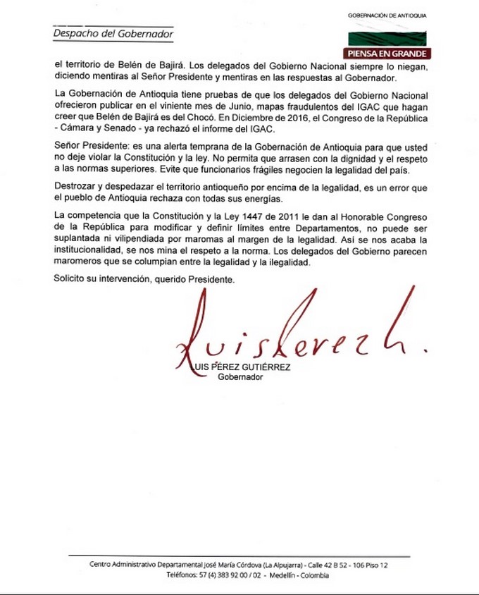 ¿Tiene razón el gobernador de Antioquia cuando en carta enviada al Presidente de la República le enfatiza que “es una alerta temprana de la Gobernación de Antioquia para que no deje violar la Constitución y la Ley. No permita que arrasen con la dignidad y el respeto a las normas superiores. Evite que funcionarios frágiles negocien la legalidad del país”?