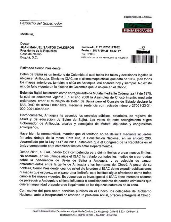 Debe tenerse en cuenta que Belén de Bajirá fue creado como corregimiento de Mutatá, mediante ordenanza 47 de 1975, la cual se encuentra vigente, como explica el gobernador Luis Pérez en carta enviada al Presidente de la República. Además, que según dicta la Constitución Nacional en su artículo 290, desarrollado por la Ley 1447 de 2011, el Congreso de la República es el único competente para establecer límites entre departamentos.